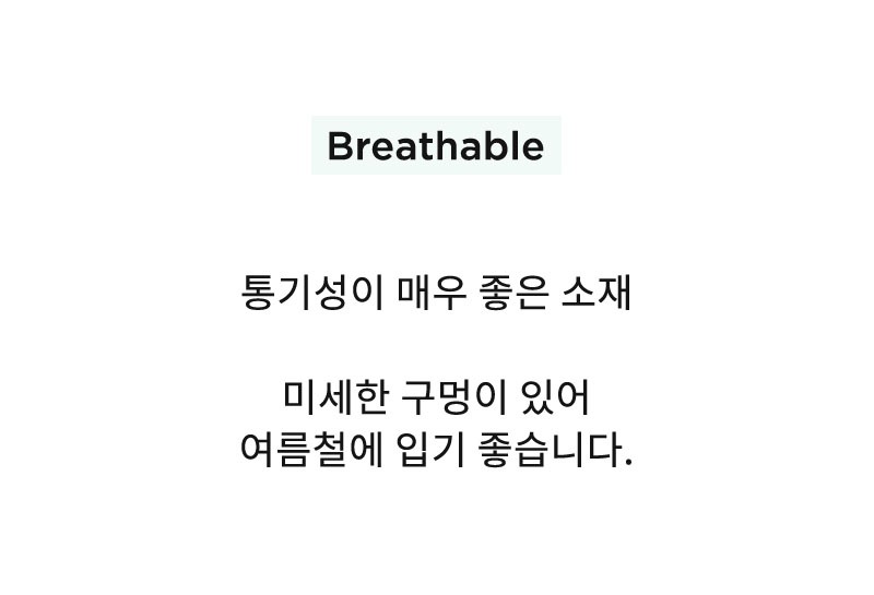가볍고 얇으며 미세한 구멍이 있어 통기성이 우수한 원단으로 쾌적한 착용감을 선사하여 더운 날씨에도 스타일링하기 좋은 아이템입니다.